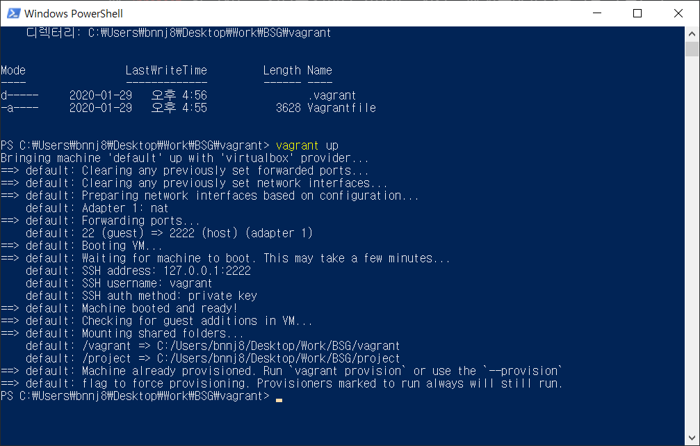 | vagrant up | 가상머신 가동 (virtual 박스를 통해 가상머신 가동) |