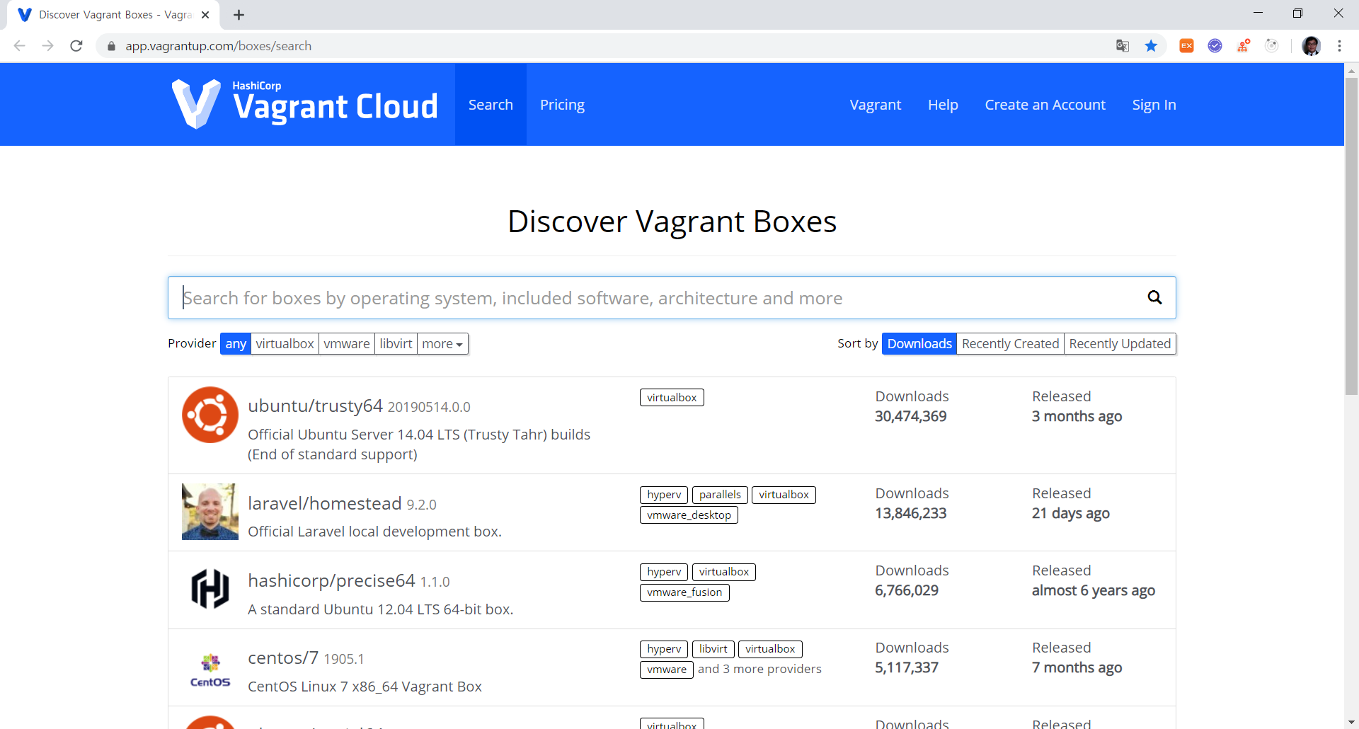 vagrant를 통해 설정을 세팅하려면 vagrant file을 만들어야 한다. 기존의 vagrant file을 가지고 있다면 바로 사용을 하면 되고 아니라면 vagrant cloud (https://app.vagrantup.com/boxes/search) 에 가서 원하는 세팅을 받아 오면 된다. vagrant file이 있다면 가상머신 가동(vagrant file이 있는 경우)으로 바로 넘어가면 된다.